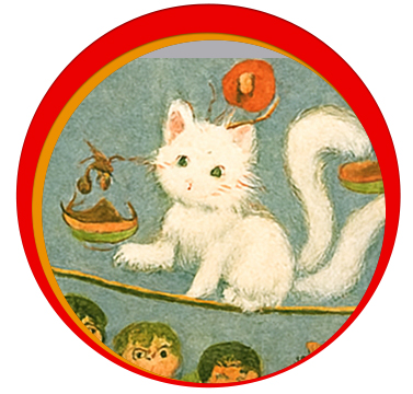 まんなかの しっぽで、ほそい つなわたり。 ぴょーん、ぴょーんと じょうずに とびはねて、 ひだりの しっぽで、おきゃくさんに ごあいさつ。 みぎの しっぽで、たかいたかい ごはんを パクッ!
