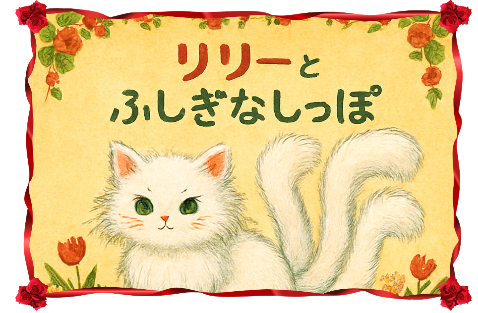 むかしむかし、とてもきれいな ペルシャねこが いました。 なまえは、リリー。 リリーには、ふつうの ねこには ない、ふしぎな しっぽが 3本 もありました。