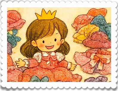 その後、お城にあった、山のようなお姫様の洋服は、クリスマスイブの晩に、サンタクロースのプレゼントとして、ぜいたく王国の貧しい人々に、そっと配られました。