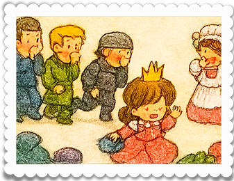 その頃、エリー姫は、ふんわりとした白いドレスの上に、金のレースのボレロ、その上に大きなリボンのついたピンクのケープ、さらにその上に、モコモコのウサギの耳つきジャケット…と、20着近くの服を重ね着して、まるで巨大な雪だるまのように、廊下をヨロヨロと歩いていました。