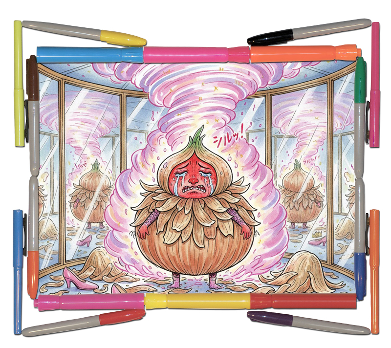 姫は、一枚、また一枚と、分厚いタマネギの皮を剥ぎ取りました。でも、タマネギの皮の下から出てくるのは、また次のタマネギの皮!