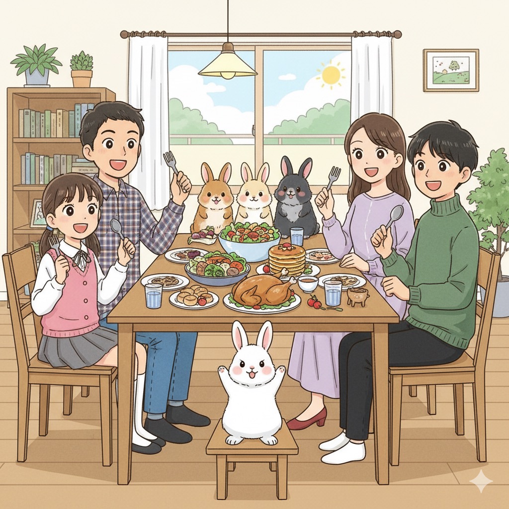 佐久間家と大原家の合同食事会は大成功。ラビットララ一家もすっかり我が家のようにくつろいだ。